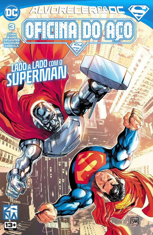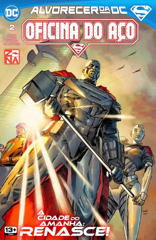 Oficina do Aço #1 DOWNLOAD SÉRIE EDIÇÃO: #2 Ficha: Título Original: Steelworks #1 Data de Lançamento: Junho de 2023 Iniciativa: Alvorecer da DC Sobre: Oficina do Aço, Capítulo Um: Cidade do Amanhã Título Original: Steelworks, CHapter One: City of TomorrowEscrito por: Michael DornDesenhos: Sami BasriArte-Final: Sami BasriCores: Andrew DalhouseLetras: Rob LeighTradução: PhantomRevisão: Cruzado de CapaDiagramação: Phantom Sinopse: Na inauguração da Oficina do Aço, John Henry promete que a empresa fornecerá tecnologia fundamental para dar suporte à infraestrutura de Metrópolis. Enquanto isso, um cidadão sem sorte é escolhido pelo misterioso Sr. Walker para um propósito desconhecido. Capas: Capa Desenhos: Clay Mann Arte-Final: Clay Mann Cores: Alejandro Sánchez Personagens: Aço (John Henry Irons) Capa Variante Desenhos: Jon Bogdanove Arte-Final: Jon Bogdanove Cores: Hi-Fi Personagens: Aço (John Henry Irons) Capa Variante Drones Desenhos: Sami Basri Arte-Final: Sami Basri Cores: Hi-Fi Personagens: Aço (John Henry Irons); Aço (Natasha Irons) Capa Variante Orgulho DC Desenhos: Joshua Swaby Arte-Final: Joshua Swaby Cores: Joshua Swaby Personagens: Aço (Natasha Irons) Capa Variante Desenhos: Ariel Colon Arte-Final: Ariel Colon Cores: Ariel Colon Personagens: Aço (John Henry Irons) Capa Variante Natasha Desenhos: Hélène Lenoble Arte-Final: Hélène Lenoble Cores: Hélène Lenoble Personagens: Aço (Natasha Irons) Aparecem: Aparecem em Oficina do Aço, Capítulo Um: Cidade do Amanhã Personagens Principais: Aço (John Henry Irons) (Flashback e História Principal) (Origem) Aço (Natasha Irons) (Flashback e História Principal) Personagens Coadjuvantes: Seguranças da Oficina do Aço (Primeira Aparição) Super-Família Superboy (Conner Kent) Supergirl (Flashback e História Principal) Superman (Clark Kent) (Flashback e História Principal) Superman (Jon Kent) Super-Man (Kong Kenan) Super-Gêmeos Osul-Ra Otho-Ra Superwoman (Lana Lang) (Flashback e História Principal) Antagonistas: Charles Walker III (Primeira Aparição) Shawn Kerry (Primeira Aparição) Stax (Primeira Aparição) Apocalypse (Apenas em Flashback) Metallo (John Corben) (Apenas em uma gravura) Ultrawoman (Lena Luthor) (Apenas em uma gravura) Bizarrete (Apenas em uma gravura) Outros Personagens: Corporação Amertek (Apenas em Flashback) Melissa Kerry (Primeira Aparição) (Túmulo) Fundo Futuro de Metrópolis (Nos bastidores) Superman (Lex Luthor) (Apenas em Flashback) Exército dos Estados Unidos (Apenas em uma gravura) Amalgama (Alvin Bundy) (Apenas Mencionado) Bibbo Bibbowski (Apenas Mencionado) Movimento Terra Azul (Apenas Mencionado) Locais: Terra 0 Terra Estados Unidos da América Metrópolis Indústrias Amertek (Apenas em Flashback) Planeta Diário Torre da Oficina do Aço Beco do Suicídio Clube Ás Cemitério da Zona Sul Sede da Corporação Walker (Primeira Aparição) Baia de Hob (Apenas Mencionada) Ilha de Lázaro Vulcão de Lázaro (Apenas Mencionado) Mundo Bélico (Apenas Mencionado) Itens: Gênese (Apenas Mencionada) Bomba da Verdade do Lex Luthor (Apenas Mencionada) Marreta Cinética (Flashback e História Principal) Armadura da Natasha Armadura do Aço Veículos: — Conceitos: Crise Sombria (Apenas Mencionada) A Morte do Superman (Apenas Mencionada) Planeta Lázaro (Apenas Mencionado) Projeto Blecaute (Apenas Mencionado) O Reino dos Super-Homens (Apenas Mencionado) Revolução do Mundo Bélico (Apenas Mencionada) Notas: Esta história se passa após os eventos de Action Comics (1938) #1053. As palavras de John Henry Irons confirmam que os eventos de Action Comics (1938) #1050 acontecem logo após o Planeta Lázaro. Esta edição contém três avaliações de danos em Metrópolis, relatando os danos colaterais de três ataques à cidade. A batalha do Superman com o Apocalypse custou cerca de US$ 5 a 10 bilhões em danos, com mais de 200 vítimas relatadas. O ataque do Dia do Centenário da Ultrawoman em Metrópolis custou cerca de US$ 1,8 bilhão em danos, com 178 vítimas relatadas. A explosão no canteiro de obras da Torre da Oficina do Aço custou cerca de US$ 579 milhões em danos, com 28 vítimas relatadas. Comentários: