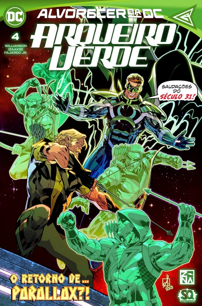 Arqueiro Verde #4 DOWNLOAD SÉRIE EDIÇÃO: #5 Ficha: Título Original: Green Arrow #4 Numeração Legada: — DC Comics, Série de 2023, Volume 7 Data de Lançamento: Setembro de 2023 Iniciativa: Alvorecer da DC Arco: — Cronologia: Pós-Flashpoint Universo: Terra 0 Sobre: Convergência Esmeralda Arqueiro Verde História em Quadrinhos 20 Páginas Título Original: Quiver HourEscrito por: Joshua WilliamsonDesenhos: Sean IzaakseArte-Final: Sean IzaakseCores: Romulo Fajardo Jr.Letras: Troy PeteriEditores: Ben Abernathy (Editor)Tradução: General Dru ZodDiagramação: Jordan Hal Sinopse: Parallax leva Ollie em uma viagem no tempo para explicar por que Ollie nunca poderá se reunir com sua família. Enquanto isso, no presente, Roy e Dinah procuram ajuda para encontrar Amanda Waller, enquanto no século 31, Lian e Connor tentam convencer Brainiac 5 a ajudá-los a retornar ao seu tempo. Capas: Desenhos: Sean Izaakse Arte-Final: Sean Izaakse Cores: Romulo Fafardo Jr. Personagens: Arqueiro Verde (Oliver Queen) (Também como constructos); Parallax (Hal Jordan); Arsenal (Roy Harper) (Constructo); Arqueiro Verde (Connor Hawke) (Constructo) Capa Variante Canário Negro Desenhos: Kunkka Arte-Final: Kunkka Cores: Kunkka Personagens: Canário Negro (Dinah Drake) Capa Variante Desenhos: James Stokoe Arte-Final: James Stokoe Cores: James Stokoe Personagens: Arqueiro Verde (Oliver Queen) Aparecem: Aparecem em Convergência Esmeralda Personagens Principais: Equipe Arqueiro Arsenal (Roy Harper) (Flashback e História Principal) Canário Negro (Dinah Drake) Gata Risonha (Lian Harper) Arqueiro Verde (Oliver Queen) (Flashback e História Principal) (Também como uma ilusão) Arqueiro Verde (Connor Hawke) Personagens Coadjuvantes: Legião dos Super-Heróis (Pós-Renascimento) Brainiac 5 Colossal Cósmico Vésper Mon-El Satúrnia Pulsar Lince Antagonistas: Amanda Waller (Nos bastidores) Tijolo Androide Oliver Queen (Personificando Arqueiro Verde/Oliver Queen (Futuro do Kamandi)) Parallax/Hal Jordan (Terra Nova) Outros Personagens: Cavaleiro (Mortimer Drake) Cizko Rei Relógio (Billy Tockman) Cúpido (Carrie Cutter) Liga da Justiça (Apenas em Flashback) Batman (Bruce Wayne) (Apenas em Flashback) Lanterna Verde (John Stewart) (Apenas em Flashback) Lanterna Verde (Kyle Rayner) (Apenas em Flashback) Parallax/Espectro/Lanterna Verde (Hal Jordan) (Apenas em Flashback) Superman (Clark Kent) (Apenas em Flashback) Mulher-Maravilha (Diana de Themyscira) (Apenas em Flashback) Flama Humana (Michael Miller) Crocodilo Mongul MDCCXCI (Apenas em Flashback) Pirata Psíquico Flecha Vermelha Mestre dos Esportes Shado (Apenas em Flashback) Conde Vertigo (Apenas Mencionado) Tropa dos Lanternas Verdes (Apenas Mencionada) Equipe Arqueiro (Futuro do Kamandi) (Apenas Mencionada) Locais: Hipertempo (Flashback e História Principal) Futuro do Kamandi (Não Nominado) Século 21 Star City (Primeira aparição completa) (Em ruínas) Futuro da Legião Pós-Renascimento Século 31 Terra Nova Metrópolis Sede da Legião dos Super-Heróis Fluxo Temporal (Nos bastidores) Futuro Não Nominado (Oliver Queen morre para salvar sua família) (Apenas Mencionado) Multiverso-1 Terra 0 2023 Estados Unidos da América Califórnia Star City A Casa do Tijolo Coast City (Apenas Mencionada) Louisiana Belle Reve (Apenas Mencionada) Multiverso Pré-Flashpoint Terra Nova (Não Nominada) (Apenas Mencionada) Itens: Dispositivo de Deslocamento (Nos bastidores) Anel do Lanterna Verde (Apenas em Flashback) Anel de Voo da Legião Flechas Especiais Tiara da Mulher-Maravilha (Apenas em Flashback) Veículos: — Conceitos: A Destruição de Coast City (Apenas Mencionada) Espectro Eletromagnético Emocional A Noite Final (Apenas Mencionada) O Grande Desastre Magia (Apenas em Flashback) Viagem no Tempo Zero Hora (Apenas em Flashback) Notas: Parallax parece ser a versão pré-Zero Houra do personagem visto anteriormente em Convergência (2015) e Telos (2015). Oliver Queen faz referência ao confronto de Parallax contra Hal Jordan em Lanterna Verde (2011) #47-50. Há um erro de continuidade nesta edição, já que William Tockman é mostrado em sua versão Novos 52/Renascimento, mas ele foi anteriormente revertido para a aparência de sua contraparte Pré-Flaspoint após o renascimento do Multiverso. Comentários: