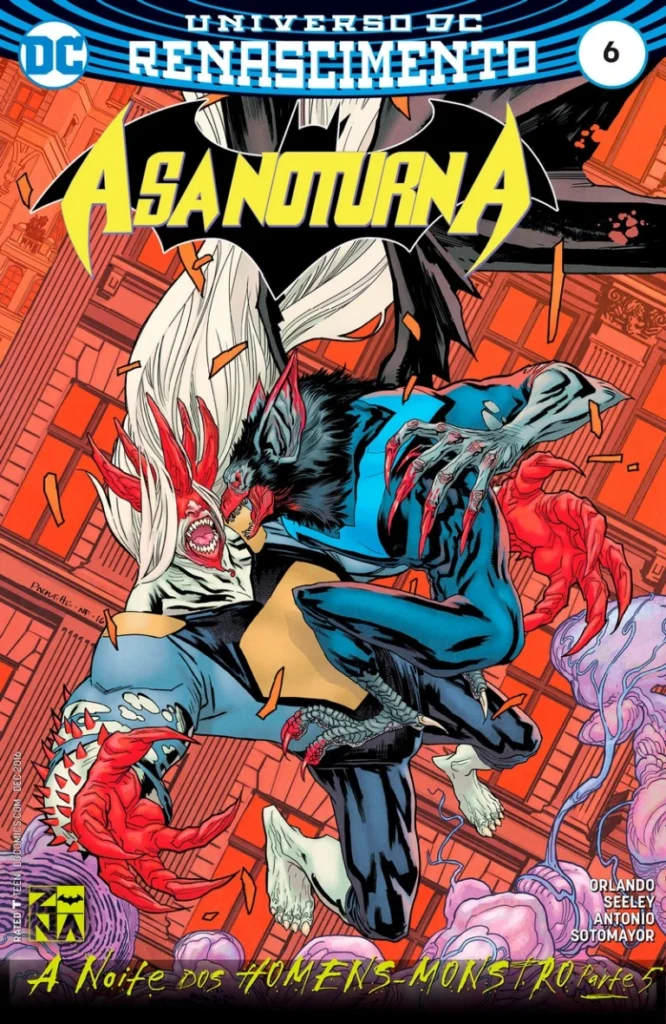 Asa Noturna #6 DOWNLOAD SÉRIE EDIÇÃO: #07 Ficha: Título Original: Nightwing #6 Numeração Legada: — DC Comics, Série de 2016, Volume 4 Data de Lançamento: Outubro de 2016 Iniciativa: Universo DC Renascimento Crossover: A Noite dos Homens-Monstro Cronologia: Pós-Flashpoint Universo: Terra 0 Sobre: A Noite dos Homens-Monstro – Parte 5 Asa Noturna História em Quadrinhos 20 Páginas Título Original: Night of the Monster Men Part 5Escrito por: Steve Orlando; Tim SeeleyDesenhos: Rogê AntonioArte-Final: Rogê AntonioCores: Chris SotomayorLetras: Carlos M. MangualEditores: Rebecca Taylor (Editora); Dave Wielgosz (Editor Assistente); Mark Doyle (Editor de Grupo)Tradução: EscoteiroRevisão: General Dru ZodDiagramação: Escoteiro Sinopse: Batwoman e Gotham Girl revertem a transformação do Asa Noturna em monstro. Depois, Asa Noturna e Spoiler descobrem como Hugo Strange criou os monstros. Capas: Desenhos: Yanick Paquette Arte-Final: Yanick Paquette Cores: Nathan Fairbairn Personagens: Asa Noturna (Dick Grayson); um homem-monstro Capa Variante Desenhos: Ivan Reis Arte-Final: Oclair Albert Cores: Sula Moon Personagens: Asa Noturna (Dick Grayson) (Transformado em monstro) Aparecem: Aparecem em A Noite dos Homens-Monstro – Parte 5 Personagens Principais: Asa Noturna (Dick Grayson) Batman (Bruce Wayne) Spoiler/Salteadora (Stephanie Brown) Personagens Coadjuvantes: Alfred Pennyworth Batwoman Cara-de-Barro (Basil Karlo) Duke Thomas Departamento de Polícia de Gotham City Detetive Harvey Bullock Gotham Girl Órfã Antagonistas: Hugo Strange Homens-Monstro Bob Castro (Em uma tela de TV ou de computador) Darcy Purnelli (Como monstro; gravado como humano) Joseph Stucci (Em uma tela de TV ou de computador) Oleg Balinoff (Em uma tela de TV ou de computador) Outros Personagens: Amanda Waller (Apenas Mencionada) Mestre das Pistas (Apenas Mencionado) Darkseid (Apenas Mencionado) Tim Drake (Apenas Mencionado) Locais: Gotham City Parque Estadual Alexander Olsen Torres Anders Batcaverna Bairro Burnley Penitenciária Blackgate (Apenas Mencionada) Catedral Irmã Arcippe Santa Prisca (Apenas Mencionada) Itens: — Veículos: — Conceitos: Invasão de Darkseid (Apenas Mencionada) Notas: Os eventos dessa edição se passam logo após Batman (2016) #8. “A Noite dos Homens-Monstro” continua em Detective Comics (1937) #942. Comentários: