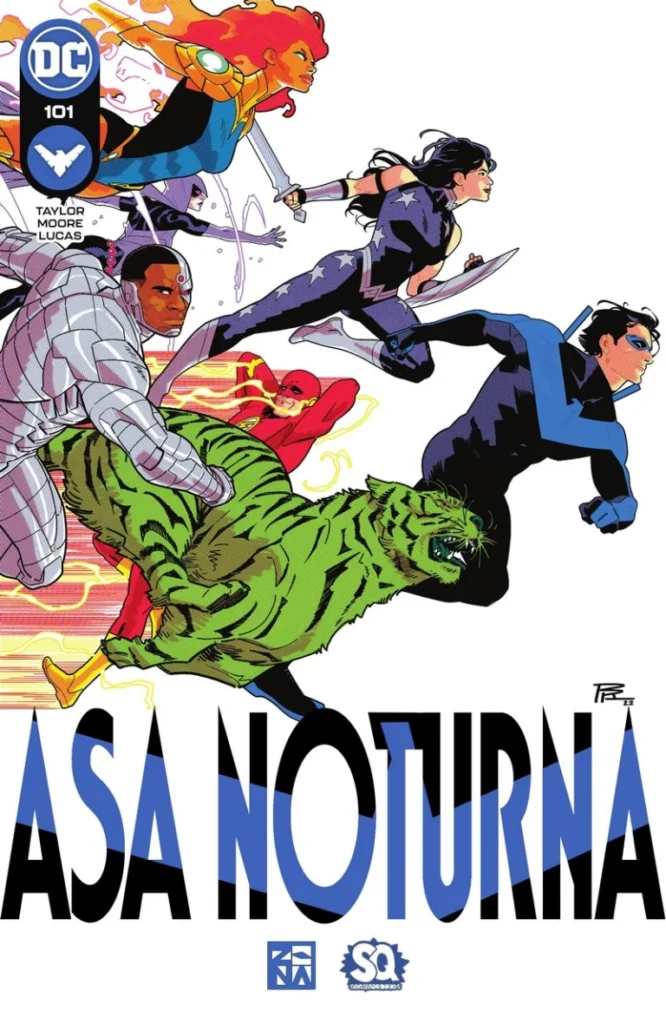 Asa Noturna #102 DOWNLOAD SÉRIE EDIÇÃO: #103 Ficha: Título Original: Nightwing #102 Numeração Legada: — DC Comics, Série de 2016, Volume 4 Data de Lançamento: Março de 2023 Iniciativa: Alvorecer da DC Arco: A Ascensão do Submundo Cronologia: Pós-Flashpoint Universo: Terra 0 Capas: Desenhos: Bruno Redondo Arte-Final: Bruno Redondo Cores: Bruno Redondo Personagens: Titãs: Asa Noturna (Dick Grayson); Estelar; Ravena; Donna Troy; Cyborg; Flash (Wally West); Rapaz-Fera Capa Variante Titãs Desenhos: Travis Moore Arte-Final: Travis Moore Cores: Tamra Bonvillain Personagens: Titãs: Asa Noturna (Dick Grayson); Estelar; Ravena; Donna Troy; Cyborg; Flash (Wally West); Rapaz-Fera Capa Variante Desenhos: Jamal Campbell Arte-Final: Jamal Campbell Cores: Jamal Campbell Personagens: Asa Noturna (Dick Grayson) Capa Variante Desenhos: Vasco Georgiev Arte-Final: Vasco Georgiev Cores: Vasco Georgiev Personagens: Asa Noturna (Dick Grayson); Oráculo (Barbara Gordon); Haley, o Cão Sobre: A Ascensão do Submundo – Parte 2 de 4 Asa Noturna História em Quadrinhos 22 Páginas Título Original: Rise of the Underworld Part 2 of 4Escrito por: Tom TaylorDesenhos: Travis MooreArte-Final: Travis MooreCores: Adriano LucasLetras: ?Editores: Jessica Berbey (Editora Assistente); Jessica Chen (Editora); Ben Abernathy (Editor de Grupo)Tradução: BxwayneRevisão: Cruzado de CapaDiagramação: Jordan Hal Sinopse: Asa Noturna e os Titãs correm para resgatar Olivia do Risonho, um metamorfo que está se passando por Asa Noturna para ganhar a confiança de Olivia Aparecem: Personagens Principais: Asa Noturna (Dick Grayson) Personagens Coadjuvantes: Asa canina (Haley) Olivia Desmond Oráculo (Barbara Gordon) Titãs Rapaz-Fera Cyborg Donna Troy Flash (Wally West) Ravena Estelar Antagonistas: Neron (Apenas em Flashback) Sorridente/Mestre do Disfarce (Spencer) (Flashback e História Principal) (Personificando Asa Noturna e Superman (Clark Kent) (Origem) Outros Personagens: Unicórnios (Apenas em uma propaganda) Arrasa-Quarteirão (Roland Desmond) (Falecido) (Apenas Mencionado) Demônios (Apenas Mencionados) Trigon (Apenas Mencionado) Rei de Vlatava (Não Nominado) (Falecido) (Apenas Mencionado) Superman (Clark Kent) (Apenas Mencionado) Locais: Terra 0 Estados Unidos da América Bludhaven Necrotério de Bludhaven Casa do Rapaz-Fera Gotham City (Apenas em Flashback) Themyscira (Apenas Mencionada) Esfera dos Deuses Inferno (Apenas Mencionado) Azarath (Apenas Mencionado) Submundo (Apenas Mencionado) Itens: Braceletse da Submissão Laço de Persuação Kryptonita (Apenas Mencionada) Veículos: — Conceitos: Tubo de Explosão Magia Notas: Não há créditos impressos na história, no entanto, Taylor, Moore e Lucas são creditados na capa desta edição. Não há título impresso na matéria, é extrapolado do título da história da edição anterior e seguinte. Uma Noite no Circo – Parte 2 Asa Noturna; Superman História em Quadrinhos 8 Páginas Título Original: Night at the Circus Part 2Escrito por: C. S. PacatDesenhista: Eduardo PansicaArte-Final: Eber FerreiraCores: Adriano LucasLetras: Wes AbbottTradução: BxwayneRevisão: Cruzado de CapaDiagramação: Jordan Hal Sinopse: Depois que Dick e Jon salvam o circo de um bombardeio, eles continuam a investigar quem está por trás dos ataques. Aparecem em Uma Noite no Circo – Parte 2 Personagens Principais: Asa Noturna/Robin (Dick Grayson) (Flashback e História Principal) Superman (Jon Kent) Personagens Coadjuvantes: Batman (Bruce Wayne) (Apenas em Flashback) Antagonistas: — Outros Personagens: Empregados do Circo Casey, o Trapezista Daniel, o Trapezista Naomi, a Apresentadora Gerente Proprietário (Primeira Aparição; Não Nominado) Corpo de Bombeiros de Bludhaven Departamento de Polícia de Bludhaven Jay Nakamura (Apenas Mencionado) Lois Lane (Apenas Mencionada) Superman (Clark Kent) (Apenas Mencionado) Locais: Bludhaven Gotham City (Apenas Mencionada) Itens: Bat-Traje (Apenas em Flashback) Cinto de Utilidades (Apenas em Flashback) Veículos: — Conceitos: — Notas: — Comentários: