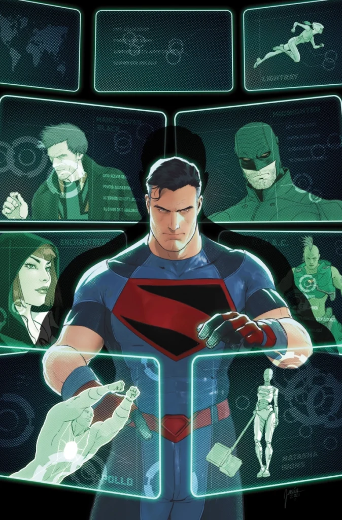 VOLTAR Superman e The Authority #1 DOWNLOAD SÉRIE EDIÇÃO: #2 Ficha: Título Original: Superman and The Authority #1 Data de Lançamento: Julho de 2021 Editora: DC Comics Capas: Diego Lopez; Jamie S. Rich Capa Desenhos: Mikel Janín Arte-Final: Mikel Janín Personagens: Superman (Clark Kent; Kal-El)); Manchester Black; Meia-Noite; Magia; O.M.A.C.; Apollo; Aço (Natasha Irons) Sobre: Todos Nossos Amanhãs Título Original: All Our TomorrowsEscritor: Grant MorrisonDesenhista: Mikel JanínArte-Final: Mikel JanínCores: Jordie BellaireLetras: Steve WandsTradutor: AntiprechadesDiagramador: Donnie Sinopse: Em 1963, o presidente Kennedy encarregou Superman de fazer o que fosse necessário para proteger o mundo. No presente, um Superman mais velho tenta convencer Manchester Black a se juntar à sua missão para salvar o mundo. Aparecem em Todos Nossos Amanhãs Personagens Principais:Superman (Flashback e História Principal) Personagens Coadjuvantes:Manchester Black Antagonistas:Criminosos da Zona Fantasma: Ursa; Xa-DuUltra-Humanóide Outros Personagens:JFK (Apenas em Flashback)Jacjeline Keneddy (Apenas em Flashback)Liga da Justiça (Apenas Mencionada)Meia-Noite (Apenas na Capa)Apollo (Apenas na Capa)Magia (Apenas na Capa)Aço (Natasha Irins) (Apenas na Capa)OMAC (Primeira Aparição) (Apenas na Capa)Lightray (Lia Nelson) (Primeira Aparição como Lightray) (Apenas na Capa)EclipsoFlor-de-LisColdcast (Primeira Aparição) Sociedade da Justiça da América (Apenas em uma Fotografia):Mulher-MaravilhaÁtomo (Al Pratt)Gavião NegroHomem-HoraStarman (Ted Knight)Doutor DestinoDoutor Meia-NoiteFlash (Jay Garrick) Locais:Estados Unidos da América:Washington, DCDallas (Apenas em Flashback) Reino Unido: Inglaterra: Sul de Londres Fortaleza da Solidão Comentários: